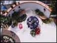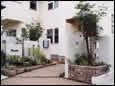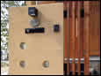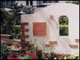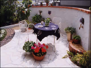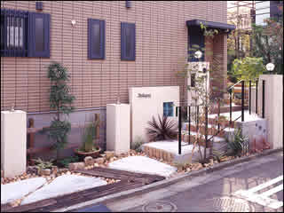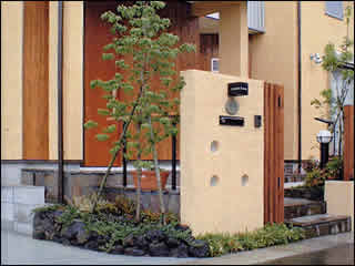 建物がシンプルなデザインなので、ロ-トアイアンやガラスブロックを使ってシャープなイメージを残しつつ、自然素材の木や石をバランス良く配した。側面の塀には、素焼きの鉢を埋め込むなど、遊び心のある楽しいエクステリアを考えた。