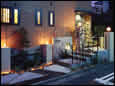 玄関先の狭いスペースを高低差を上手に使って、お洒落な空間に仕上げている。また、照明によって浮かび上がる直線的なシルエットやガラスブロックが、夜のエクステリアを魅力的に演出している。