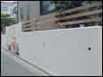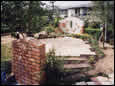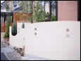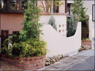 住宅の勝手口側ではあるが、手を抜かないで、きちんとデザインされている。また、単調で重くなりがちな塀に、曲線や高低差を取り入れて、楽しい空間に仕上がっている。