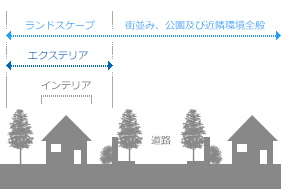 「エクステリア」と「ランドスケープ」の違いは、単純に言えば、その範囲。「エクステリア」が、個人宅や特定の施設の敷地に範囲を限定されるのに対し、「ランドスケープ」は、その外側の街並み、公園、商業施設など広範囲に拡がる生活環境を指します。両者は別の概念ですが、「エクステリア」は、「ランドスケープ」の一部を構成していると言えます。