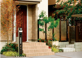 道路との境界を塀や柵などで仕切らないスタイルのエクステリア デザイン。一般的に、玄関までのアプローチの途中に門扉を設けず、表札、ポスト、インターホンなど必要最低限の機能を持たせた門柱などのパーツにより構成されます。開放的でのびのびとした印象が特徴。植物を多用するなど、街並みへの配慮、そして防犯性やプライバシーの確保に注意が必要です。
