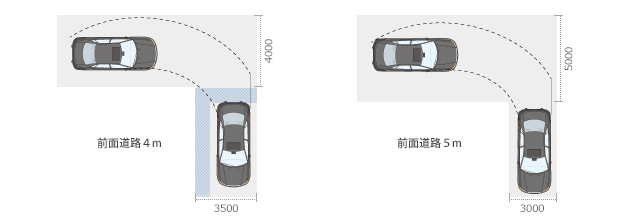 道路と接する駐車スペースは、前面道路の状態によって左右されますが、その際、車の通り道については充分シミュレーションしておきましょう。たとえば、直角駐車の場合、軌跡が外側にふくらむため、前面道路幅が狭いと、駐車スペースの幅を広くとる必要があります。
