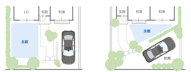 和室の眺望を犠牲にしたくない場合は、斜め駐車が有効。緑のバランスも重要。