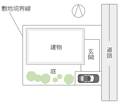 南側を広く開けられるため日当たり良好。一般に、住まいには理想的とされますが、南側にさまざまな機能が集中し、スペースに余裕がなくなる傾向があるため、ライフスタイルに合ったしっかりしたエクステリア計画が必要です。また、道路側からの視線対策など、プライバシーの確保が課題となります。