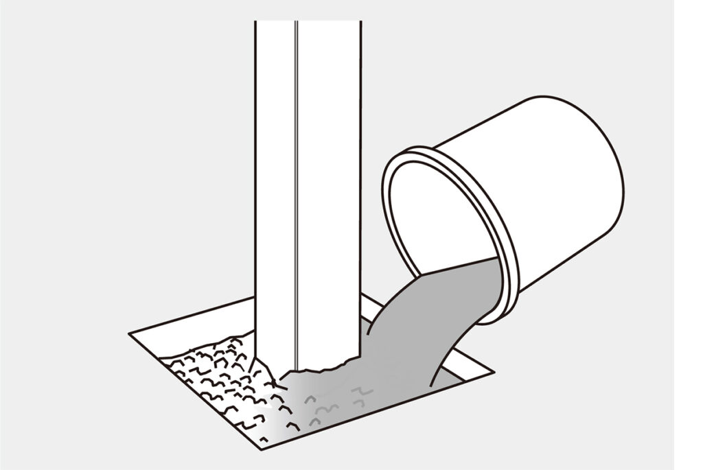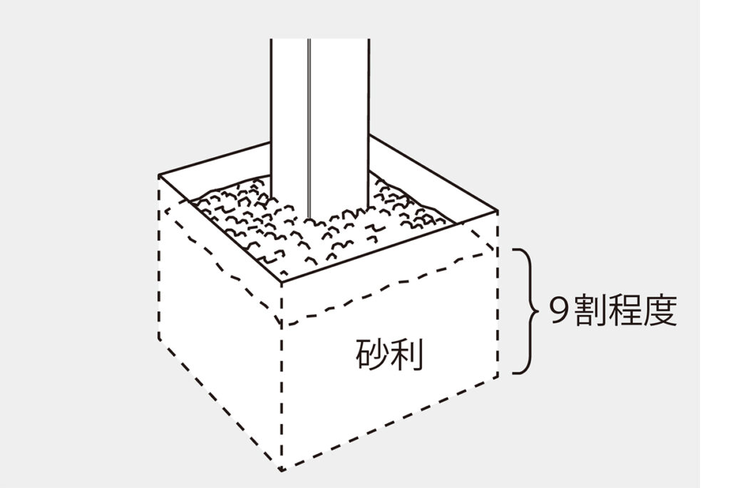 基礎穴に埋設する支柱をたてて仮固定し、あらかじめ水で湿らせた砂利(推奨サイズ:5~15㎜程度)を埋込深さの9割程度まで詰めます。