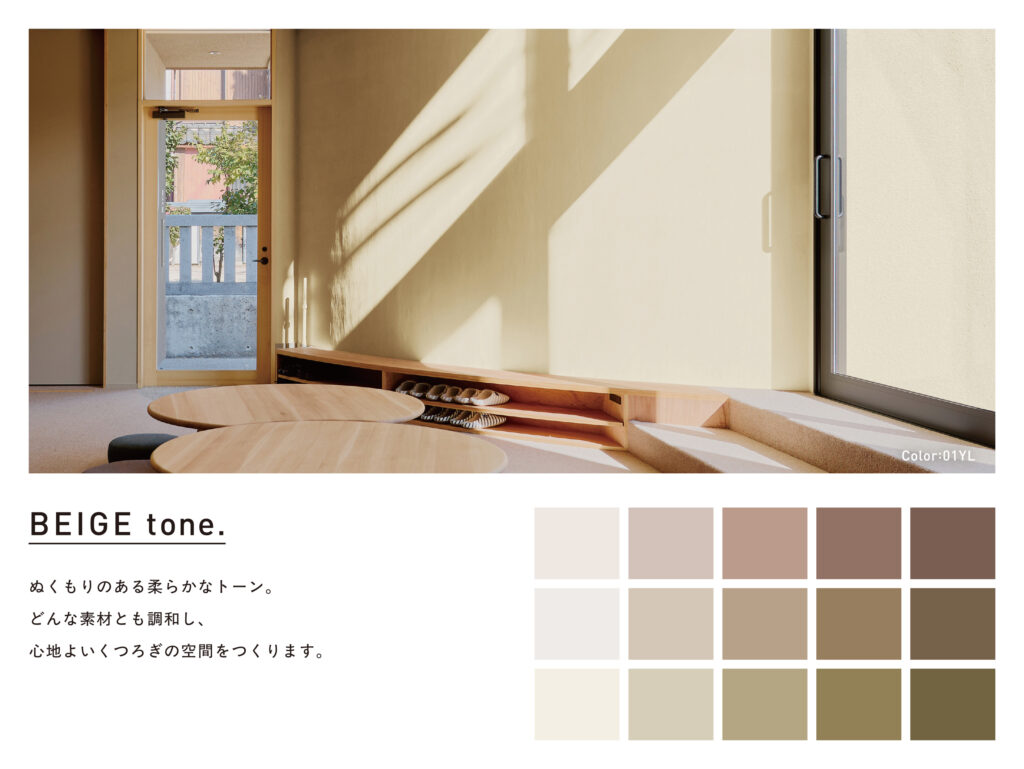 調和のとれた色相と選びやすい明度のカラーラインナップは、これまでの塗り壁のイメージを刷新し、空間デザインに携わる皆さまの創造力に応えます。「自然素材の質感×NUANCE COLOR(ニュアンスカラー)」で上質な空間づくりがご提案いただけます。