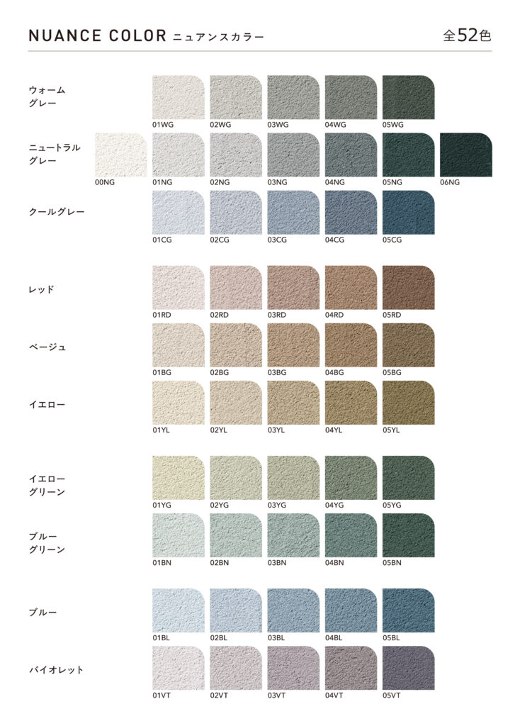 NUANCE COLOR(ニュアンスカラー)は、空間に馴染みやすく洗練されたトレンドカラーの中からデザイナーの感性を刺激する52色を厳選しました。「ありそうでなかった色」、「心に響く色」、「空間に新たな表情を生み出す色」そうした想いを込めて、ひとつひとつの色を丁寧につくりあげました。