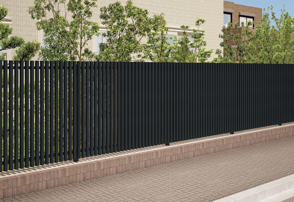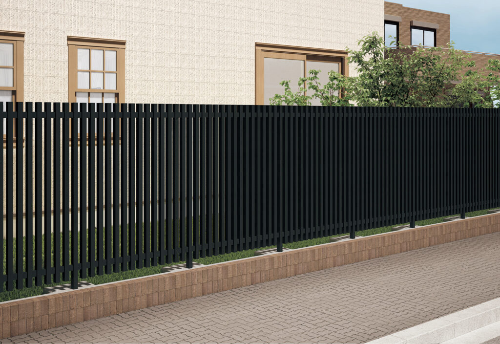 アレグリアフェンスTM1型/TL1型は、ボリューム感のある縦格子デザインで適度な目隠し効果があり、集合住宅や保育施設などに多く採用されています。木調カラーとアルミカラーの2タイプをラインナップしており、今回、アルミカラーにトレンドのブラックつや消し色が加わりました。