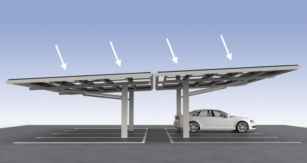 「ソリスルーフ」は、4台駐車分の屋根を2本の柱で支える独自の後方支持方式を採用。連棟設置した際も柱の本数が少なく、かつ入出庫や乗り降りがしやすい広々とした駐車スペースをつくることができます。両面発電式のソーラーパネルと屋根を一体化したスマートなデザインで、屋根の下面からも受光できるため発電効率に優れています。