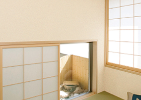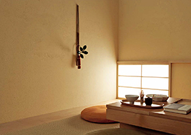 砂で仕上げた塗り壁で、なめらかな美しさが特徴。土壁同様、風情重視の茶室や客間に用いられるほか、洋室に合うタイプも。上塗り用の砂には、粒子が均一で異物の混入が少ない、川砂が理想とされています。