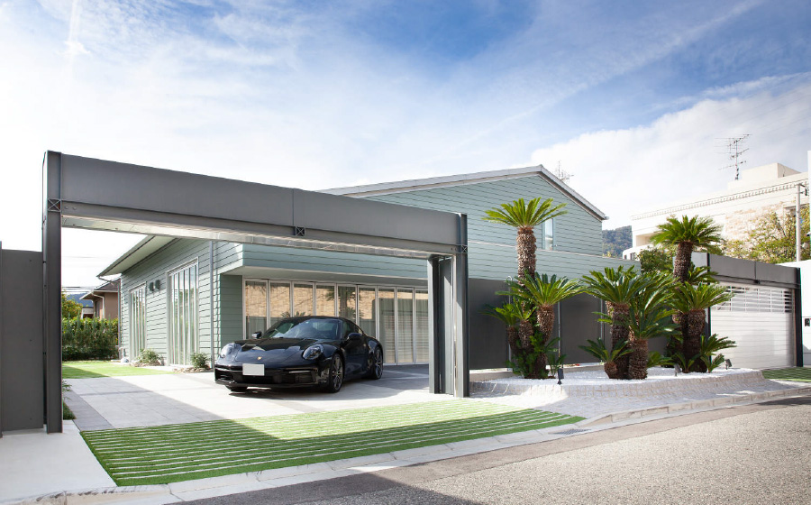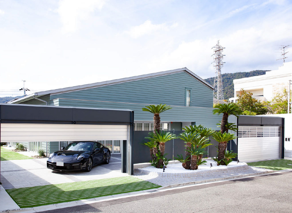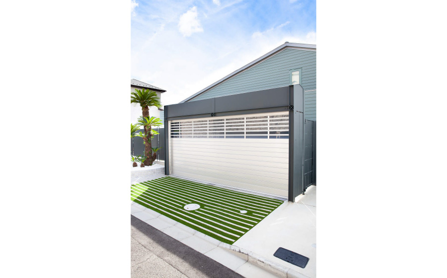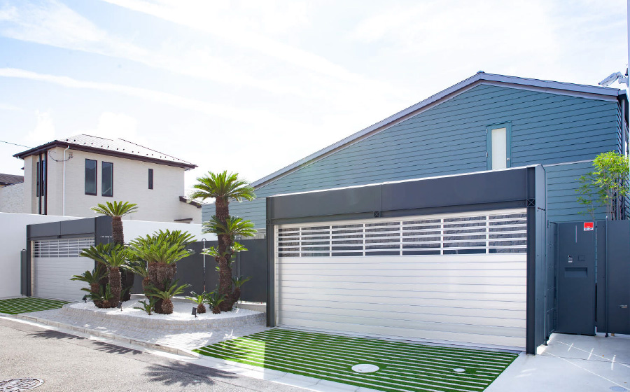 敷地の余裕を活かし道路からセットバックして設置したユニットシャッターは、植え込み部を挟んでシンメトリーに配置することで安定感のある門構えを実現しています。また無機質になりがちな床面を芝生敷きにすることで潤いあるものとなっています。