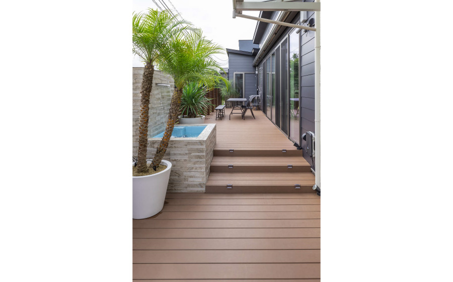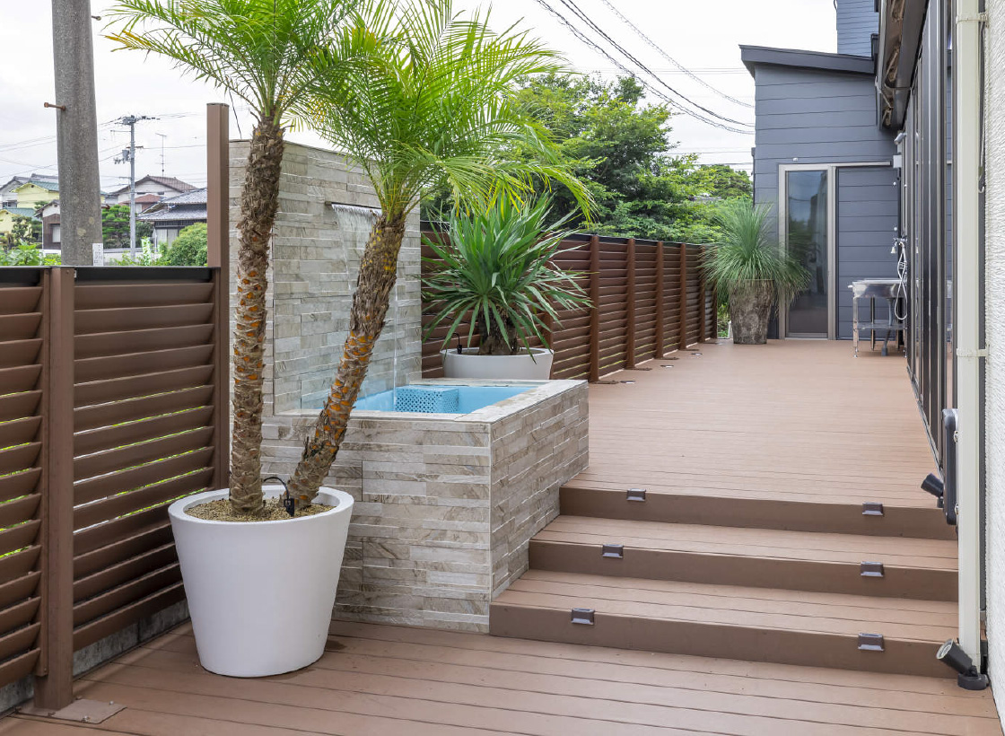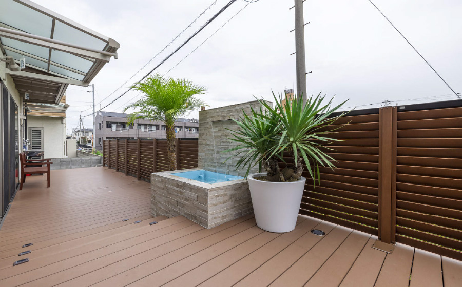 デッキを増築するにあたり、デッキ上に設置するフェンスに仕様変更があったため、中間に水が流れる滝状のエリアを設け違和感を軽減する様工夫されています。
