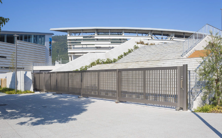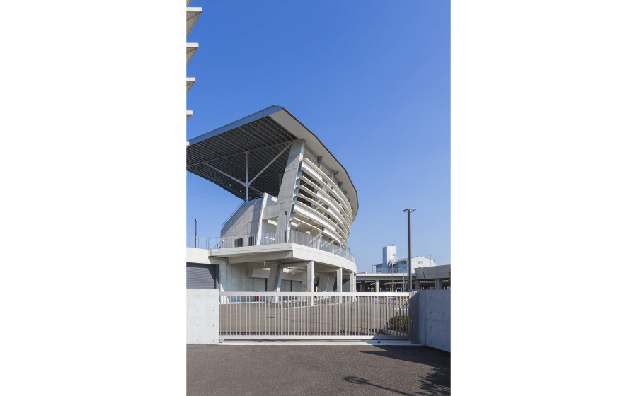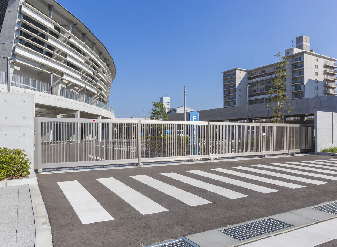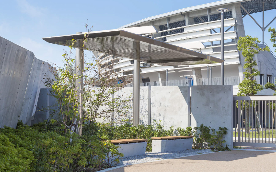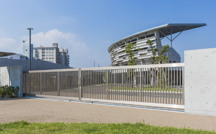外構は全て縦格子デザインで統一。競技場との調和を意識しました。