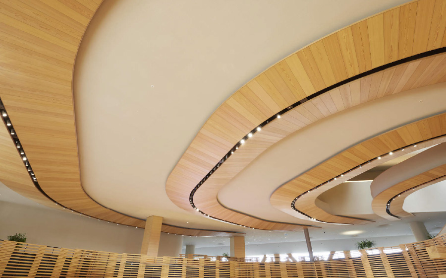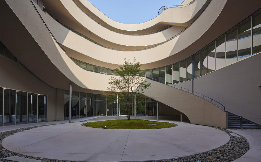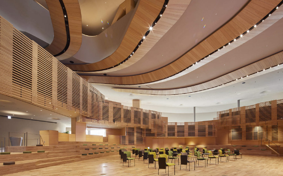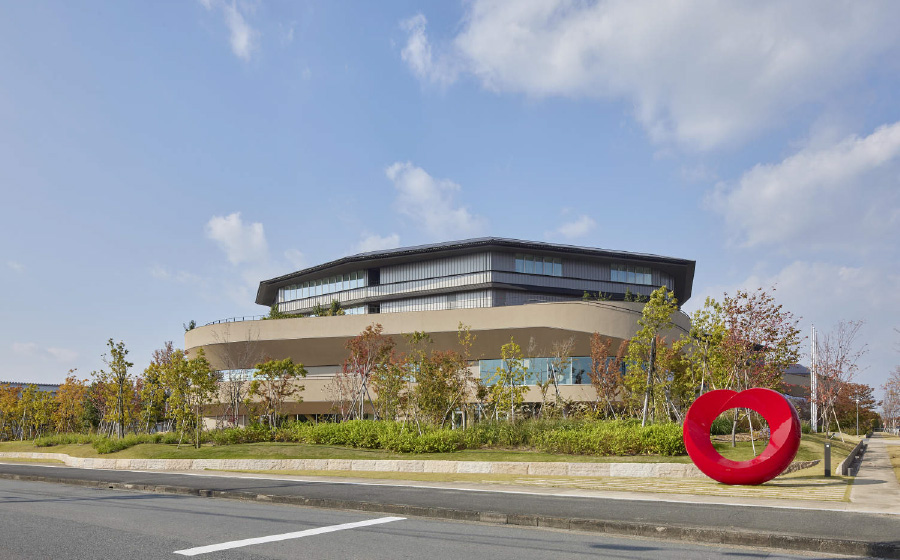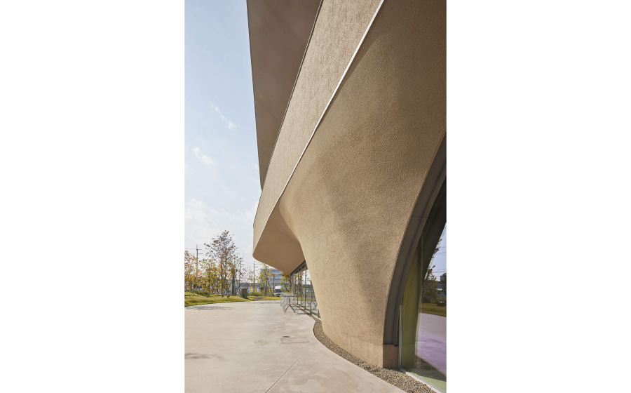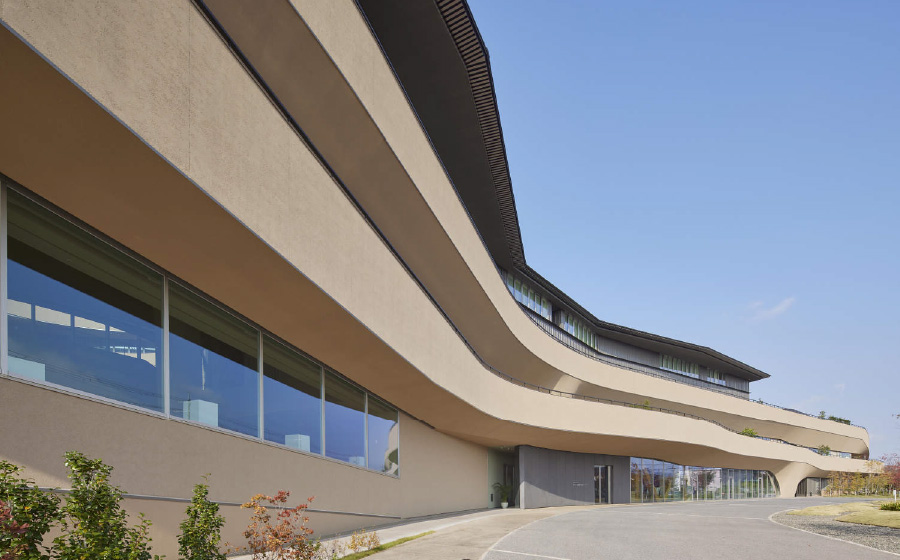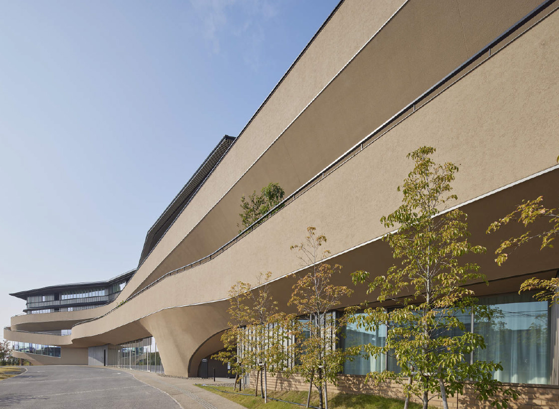 有機的な面で構成されたダイナミックな意匠の建物は交流の場としてのコンセプトが表現されています。外壁は地元の奈良土をブレンドした特別な外装材で仕上げることで味わい深い仕上がりと共に、悠久の時間の流れや未来を感じさせる意図が込められています。